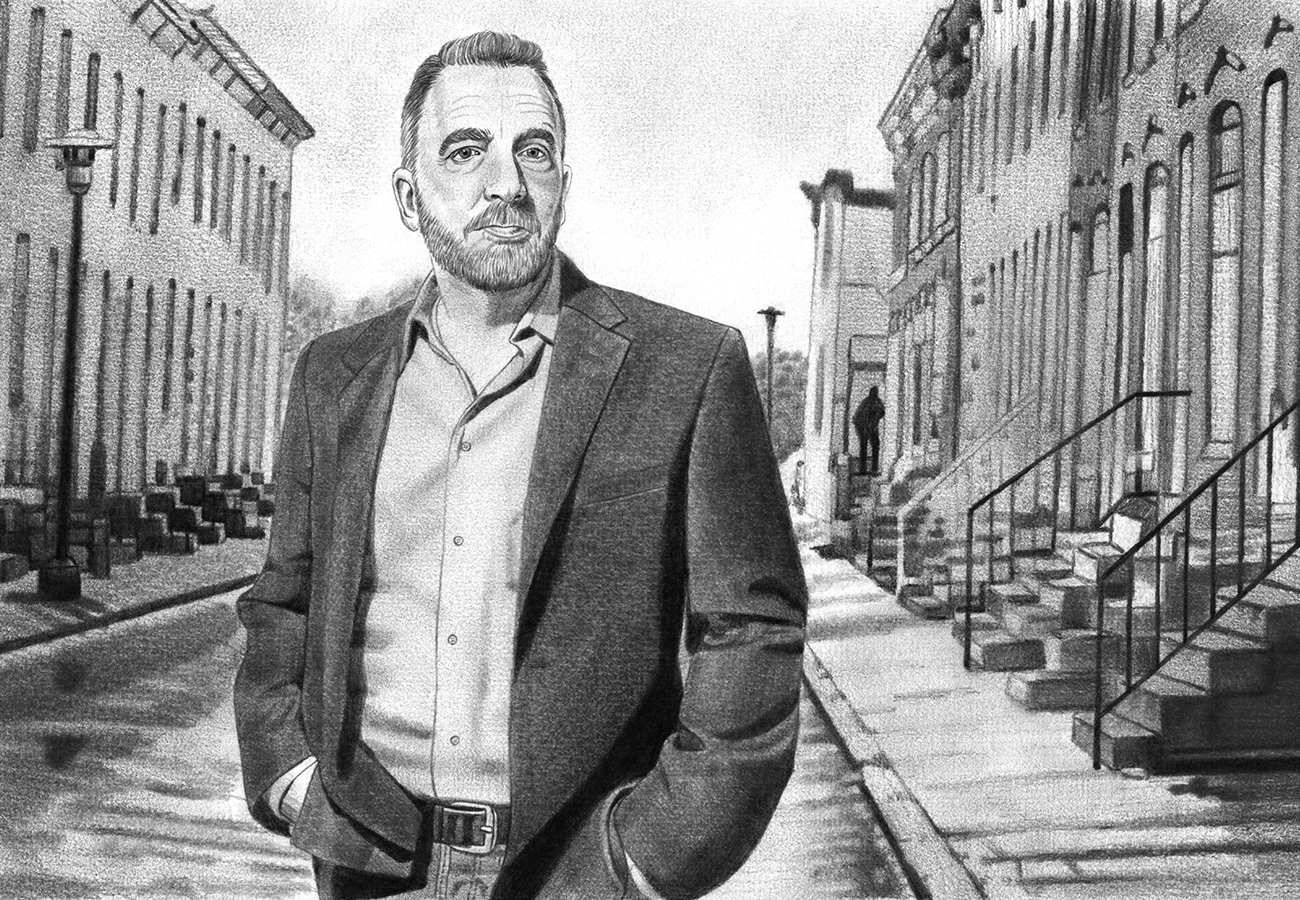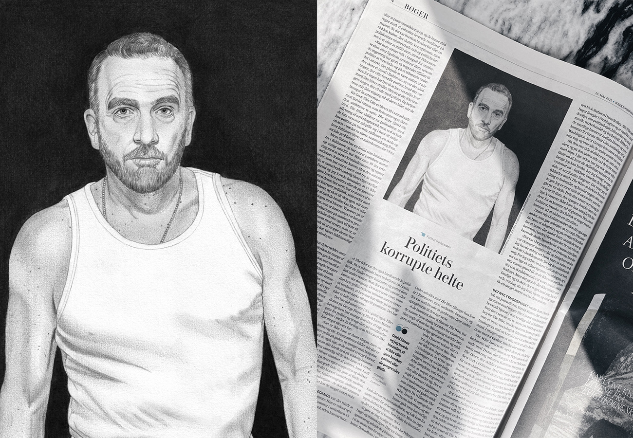 Frontpage and article illustration of George Pelecanos for the book section of Weekendavisen.